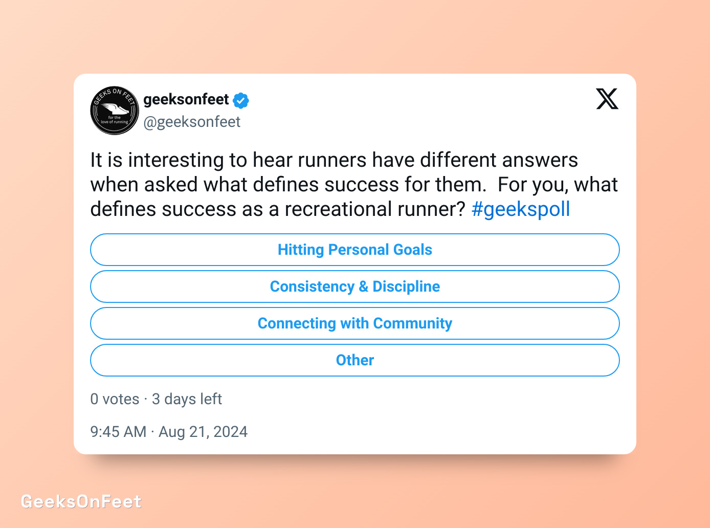 When asked what defines success, it is interesting to hear runners have different answers. For you, what defines success as a recreational runner? #geekspoll